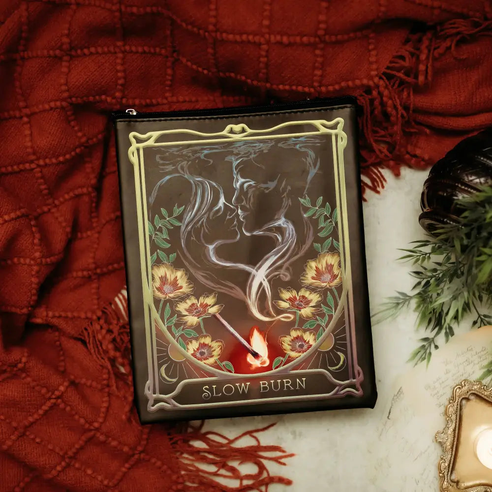 Lizz from @doomandbloomstudios created the artwork on this bookish trope zippered book sleeve!
