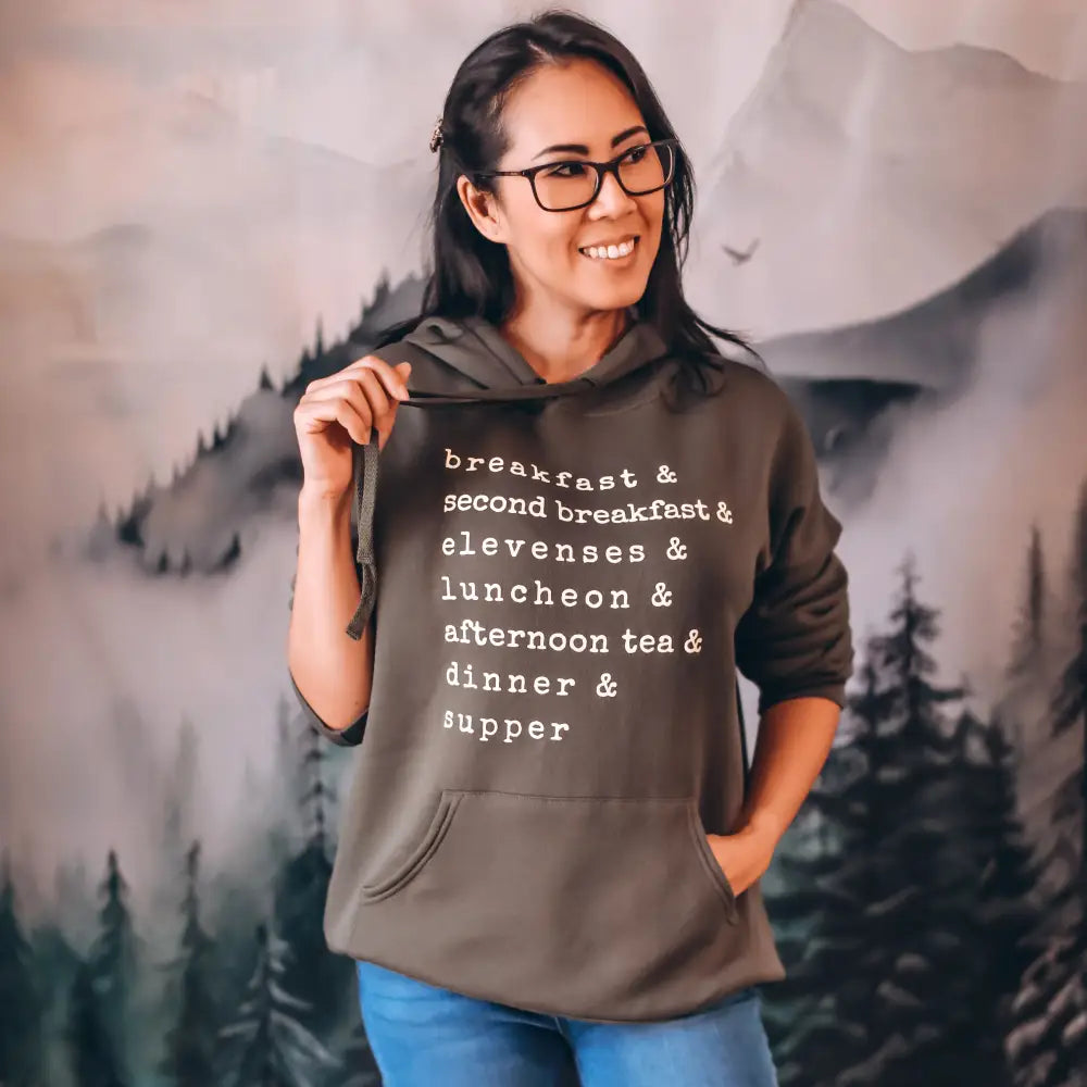 Printed on an ultra-comfy military green-colored hooded sweatshirt with cream ink.