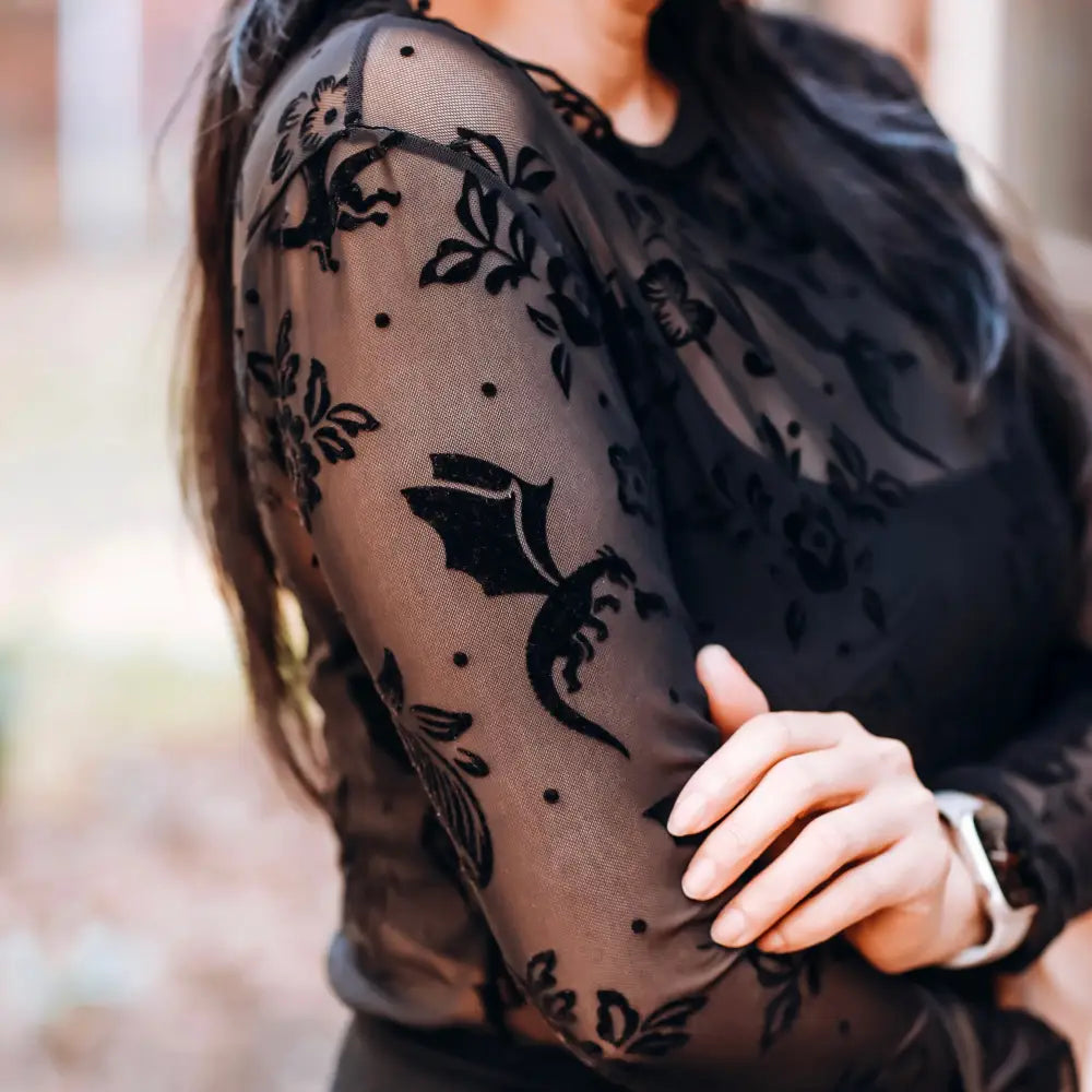 The cutest lace mesh top- now for book dragons like us! Designed by @thebookishshop with layering in mind. Available in black and cream.
