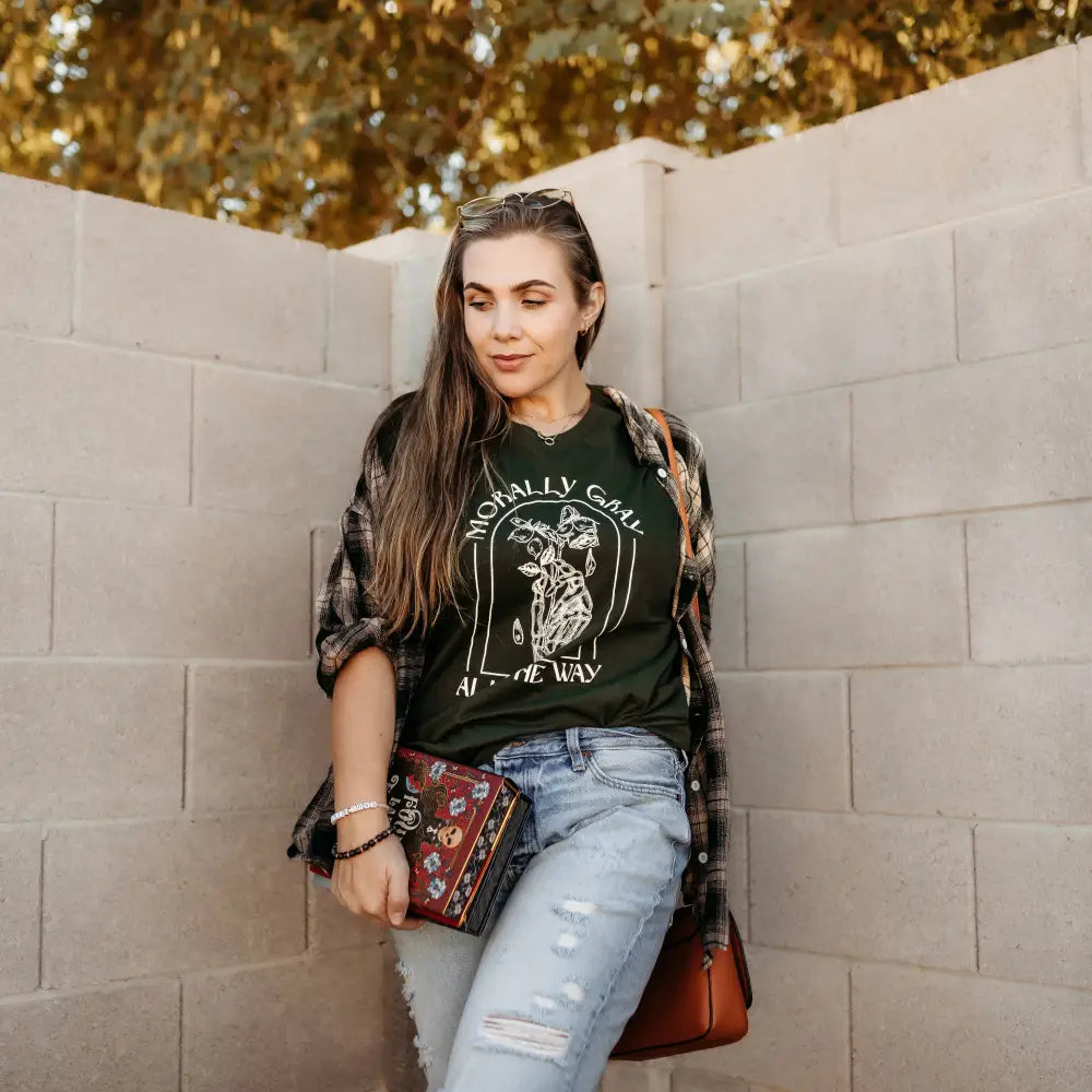 Printed on our ultra soft, unisex dark oliveĀ tee with creamĀ ink.