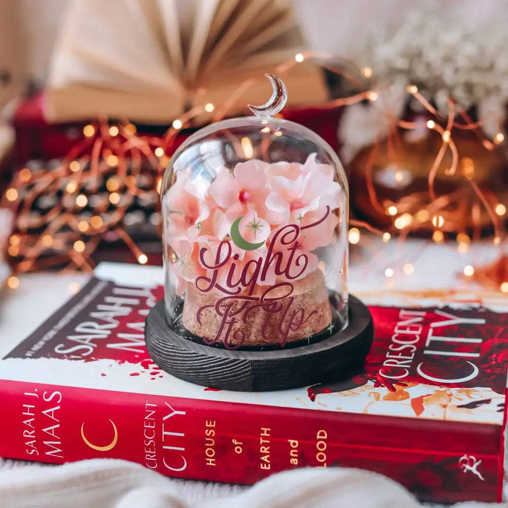 Light up your space with a little Crescent City magic! This cloche inspired by Sarah J. Maas's Crescent City is the perfect way to showcase your most treasured trinkets—a favorite candle, a spark of stardust, or a relic straight from the House of Earth and Blood. Just like Bryce’s shield of light, this cloche protects your precious decor while letting it shine for all to see.